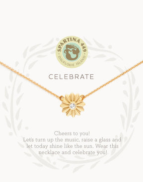 Wear our Celebrate Necklace as a reminder to celebrate you. Featuring a sunburst charm, this special piece comes packaged inside a beautiful box with the message: "Cheers to you! Let's turn up the music, raise a glass and let today shine like the