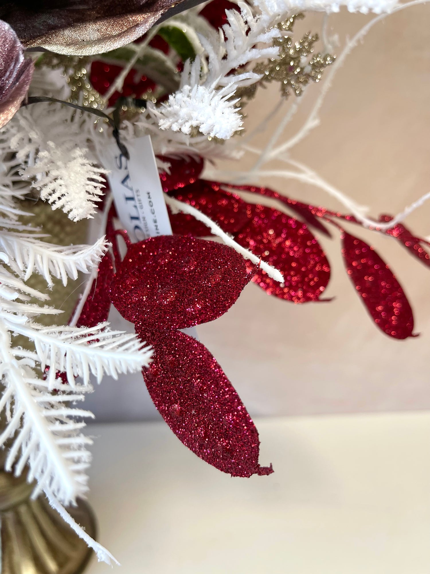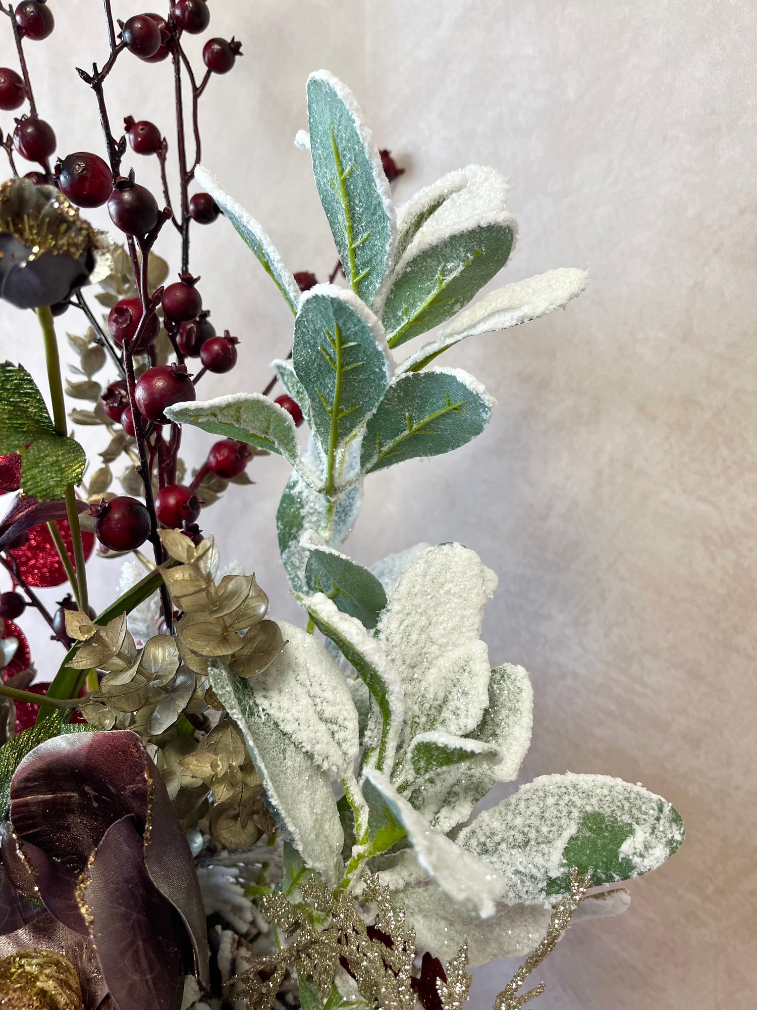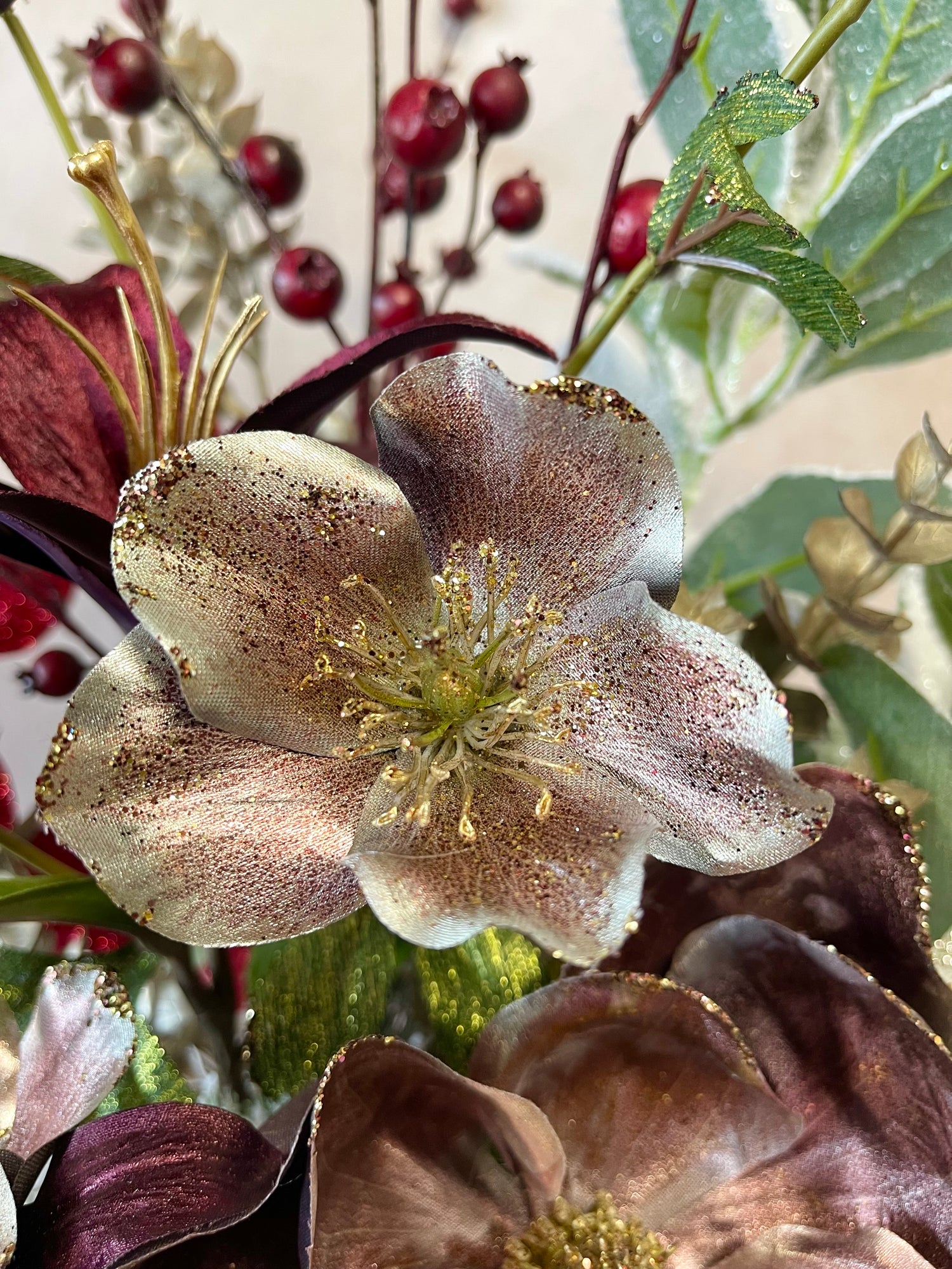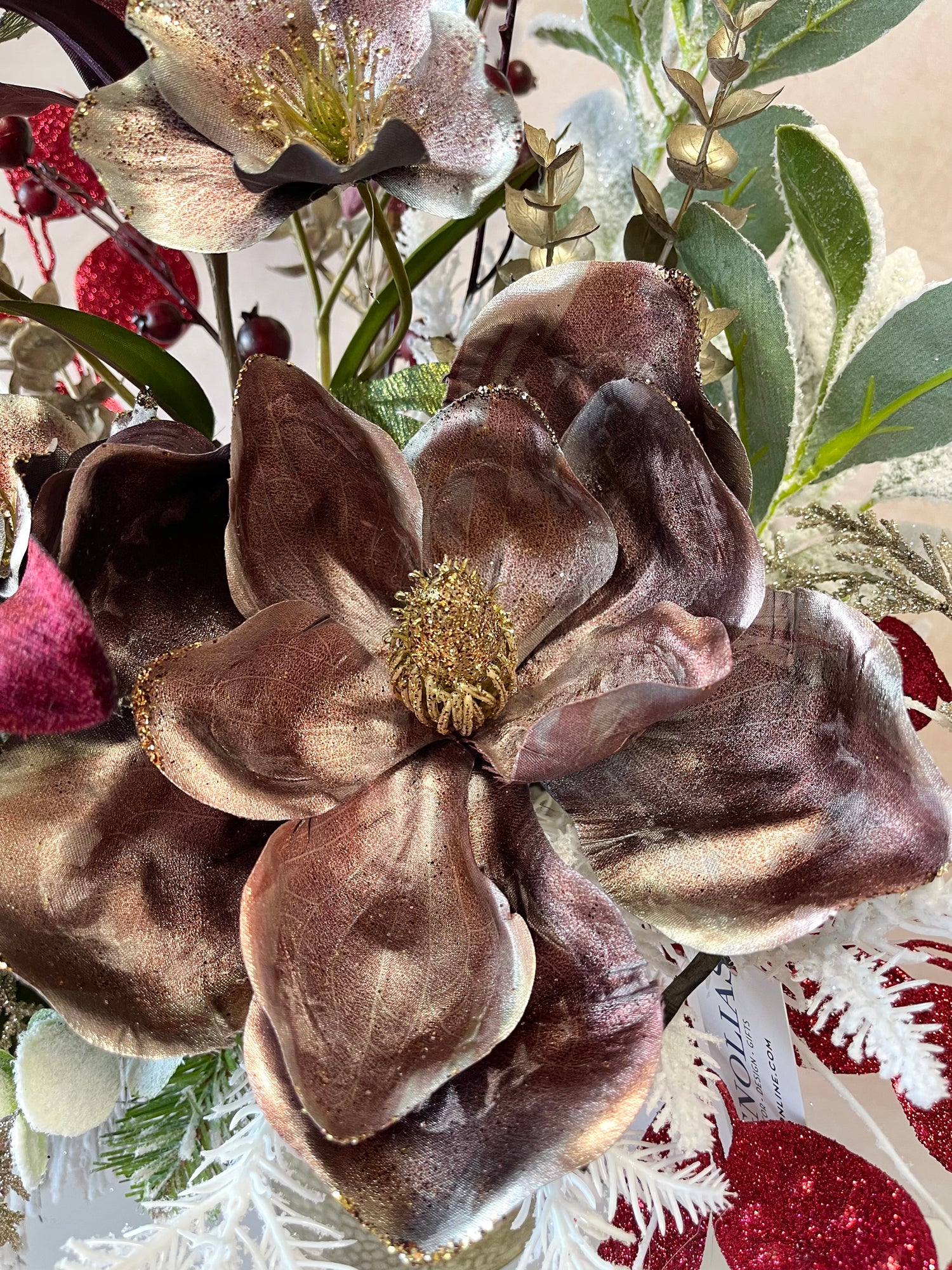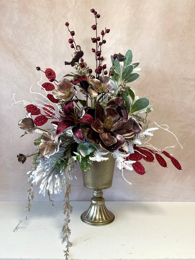 This centerpiece is a one-of-a-kind festive arrangement made by our floral designers.