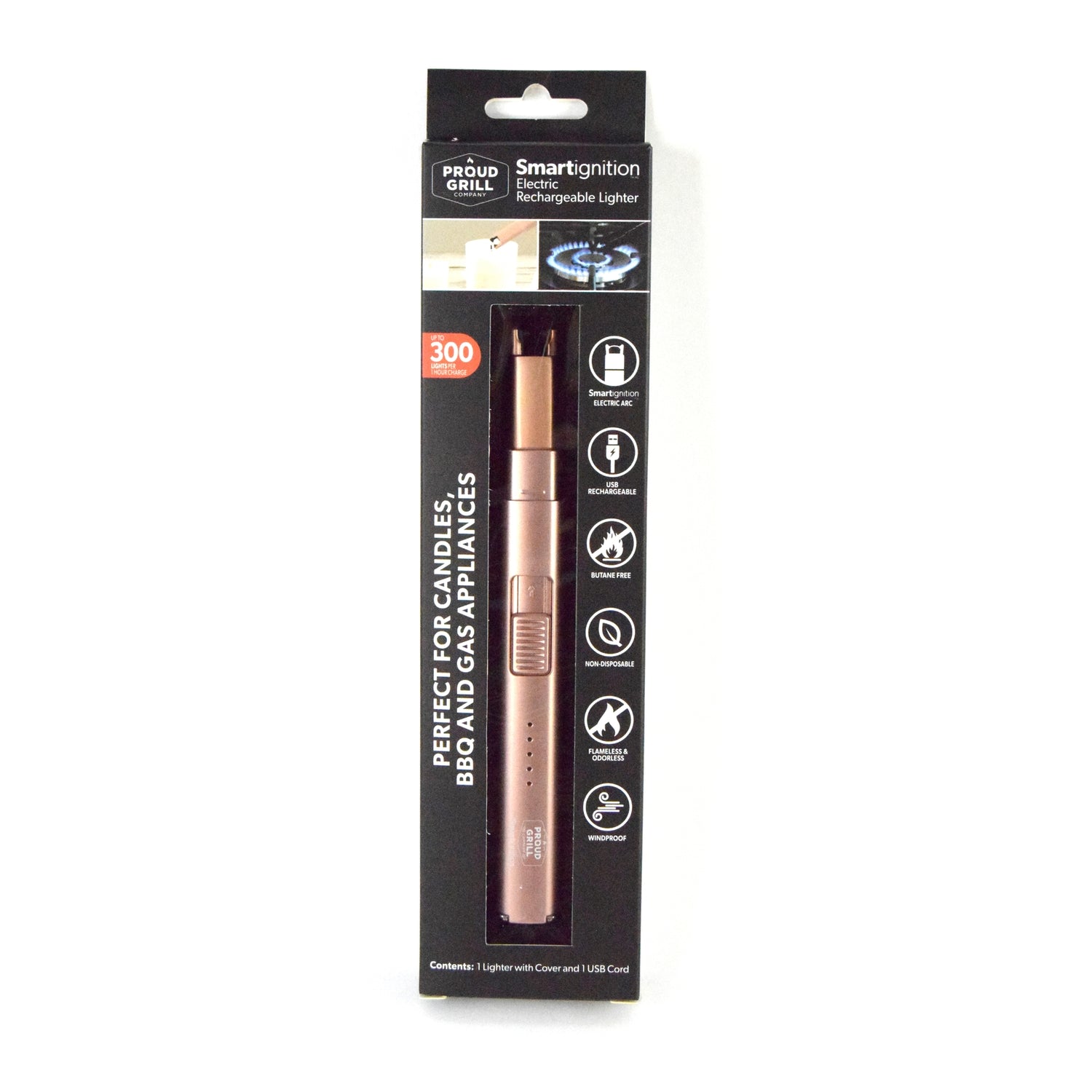 Eco-safe Lighter Made Simple! Our Smartignition Electric Home & Grill Rechargeable USB Lighter uses an electric arc to ignite candles, grills, gas appliances, and more. This eco-smart non-disposable lighter charges with the included USB cord and you get up to 300 lights per charge. Butane-free, flameless, no smell, and windproof. This portable compact electric lighter has a cover, hanging hook, and a safety switch. Available in Rose Gold.