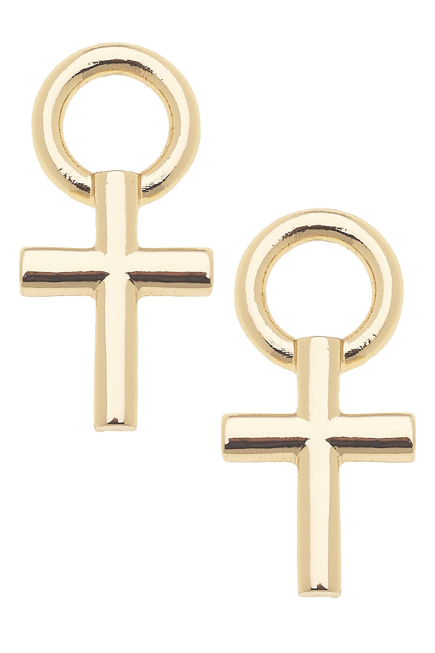 Classic and versatile, these cross huggie charms in shiny gold are a timeless addition to your accessory lineup. Perfect for adding a meaningful touch to any outfit. DETAILS Base Metal with Shiny Gold Plating .75"L x .5"W
