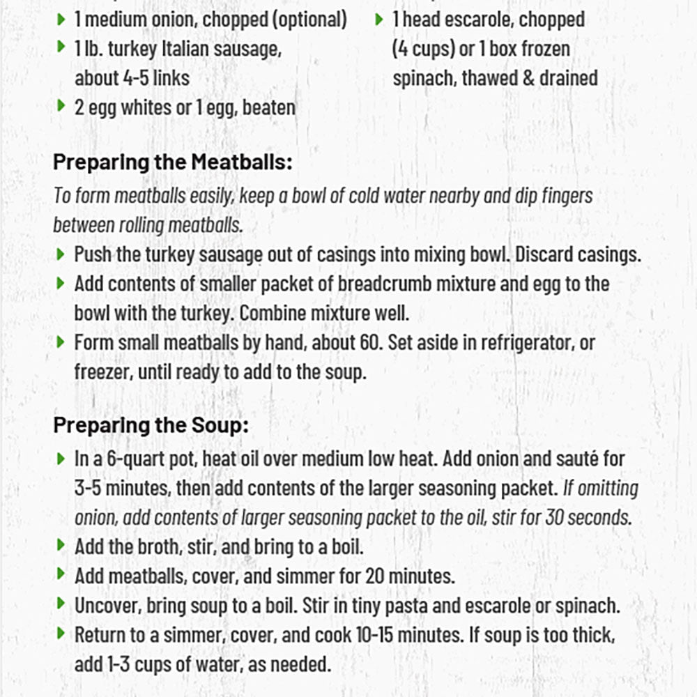 This all-natural, soup mix includes our signature whole grains seasoning blend, designed to mix with ground turkey or Turkey Italian sausage for tender, flavorful meatballs. Add broth and pastini pasta, and let it simmer into a comforting, family-style meal that tastes like it’s been passed down for generations.