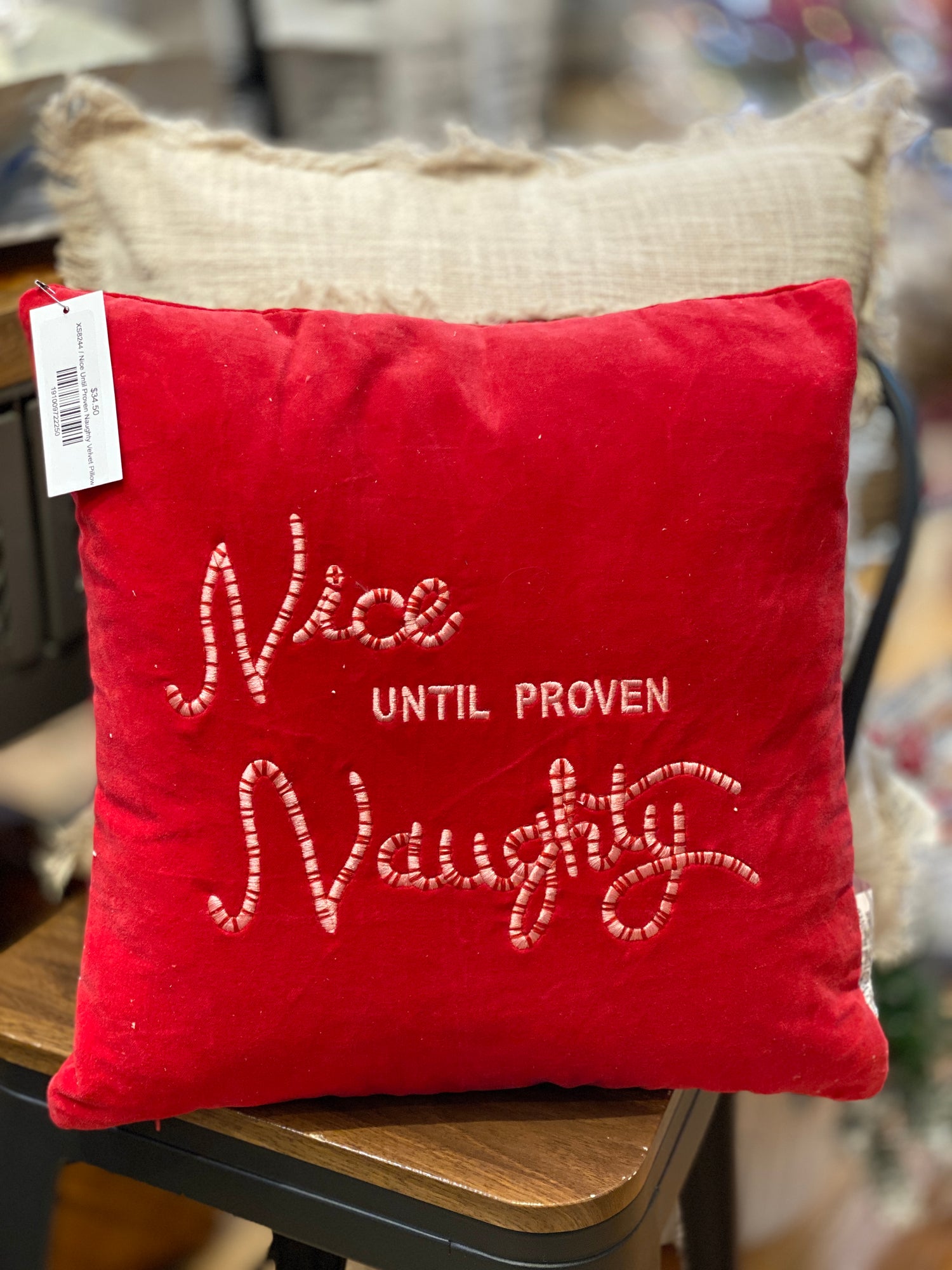 Nice Until Proven Naughty Velvet Pillow is backordered and will ship as soon as it is back in stock.