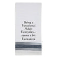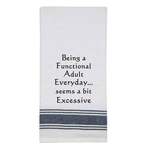 White Kitchen Tea Towel with black lined trim "Being a Functional adult everyday... seems a bit excessive." • Fun Kitchen Tea Towel • 100% Cotton Twill • 16x26 inches • Machine Washable • Not a Flour Sack • Hand Printed • Perfect gift for any occasion