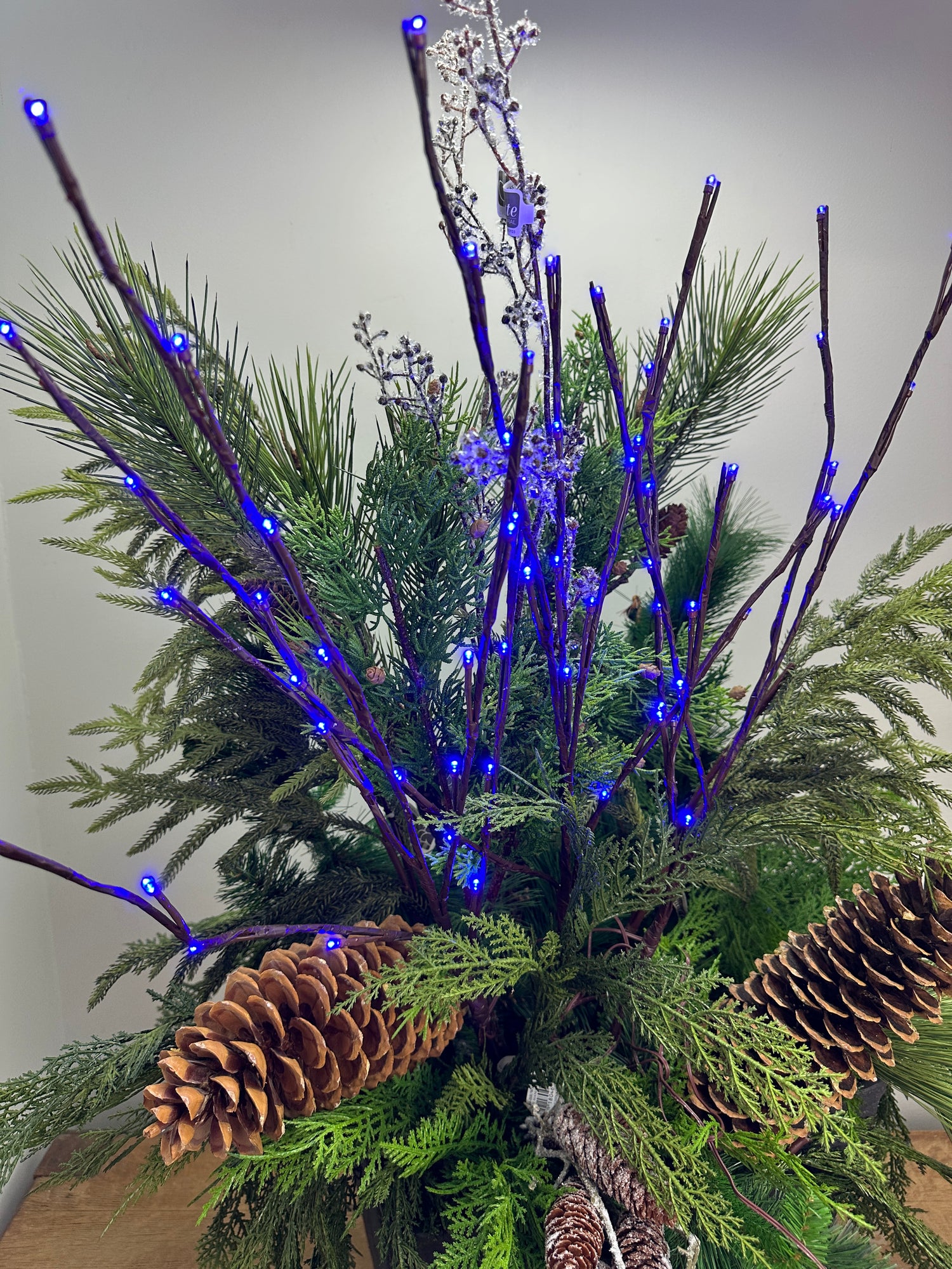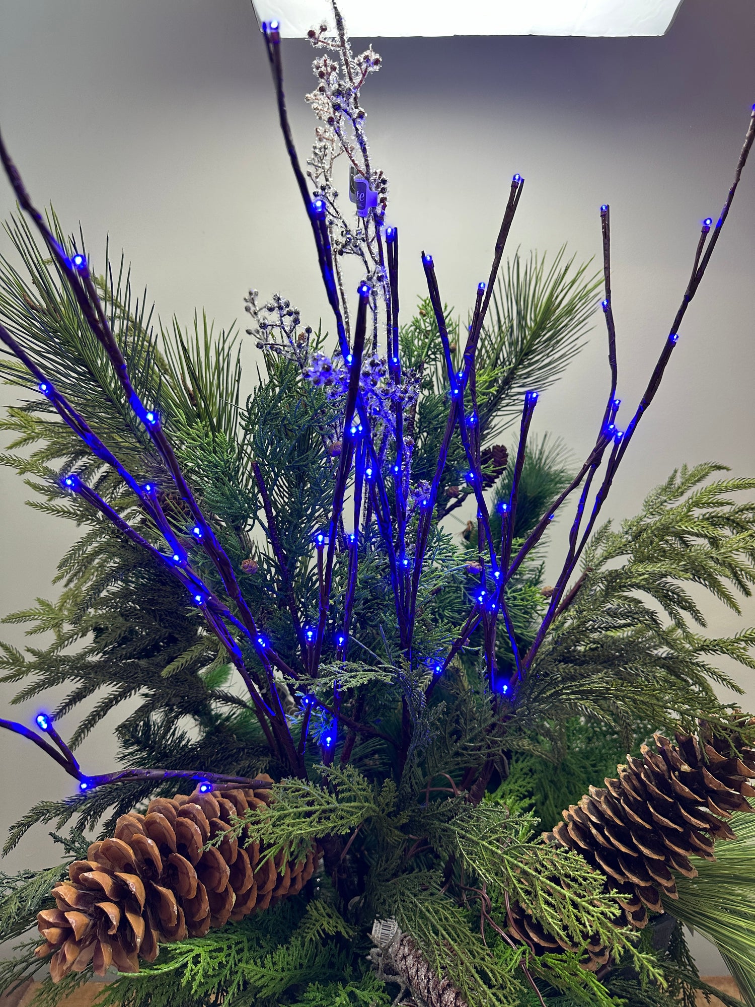 LED Twigs consist of three connected 32" stakes with wire wrapped stems. Each set of twigs has 60 lights. The smaller size makes Twig lights perfect for indoor or outdoor use in floral displays, trees, or staked into the ground. A 45" lead cord and 30" cord between each stake gives you extra length to work with when creating standalone displays.