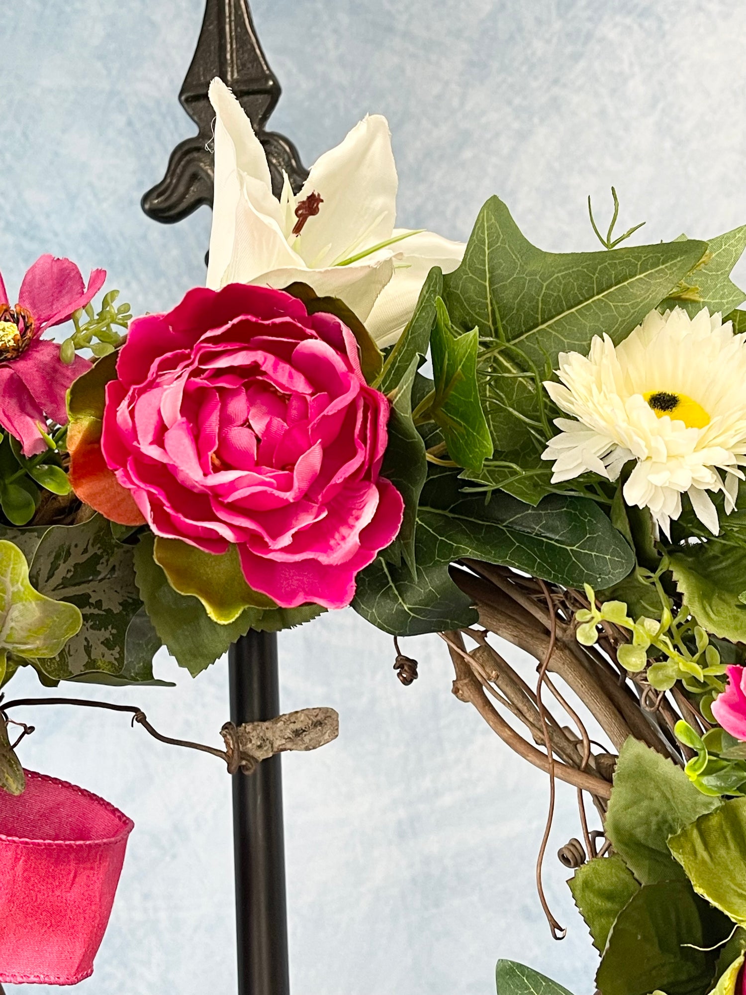 Spice up any wall, door, or entryway with this festive and stunning silk floral design.