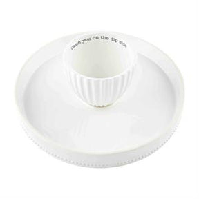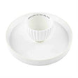 Beaded ceramic server with attached fluted pedestal flips to become a dip bowl and platter for snack service.