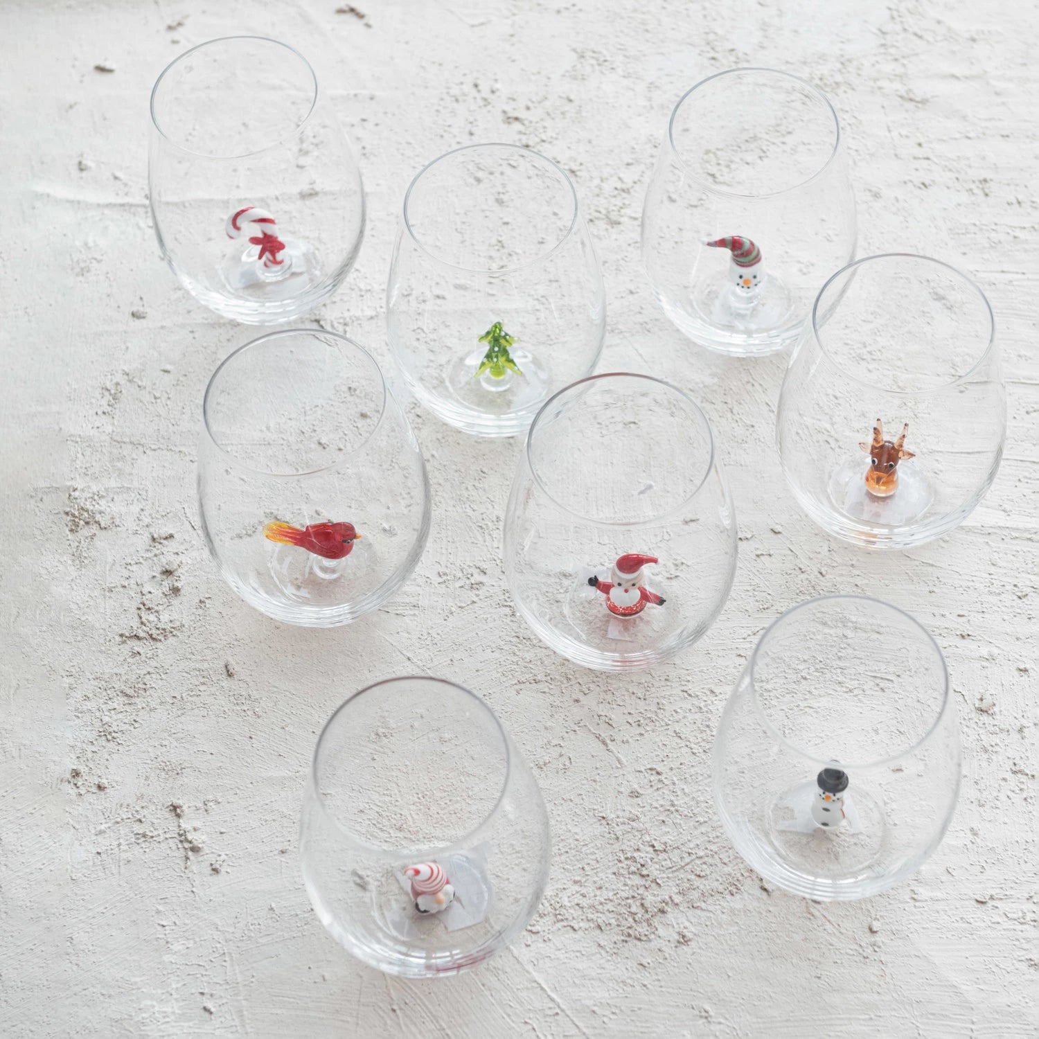 3-1/2" Round x 4-3/4"H Stemless Wine Glass w/ Hand-Blown Holiday Figure Inside, Multi Color, 8 Styles