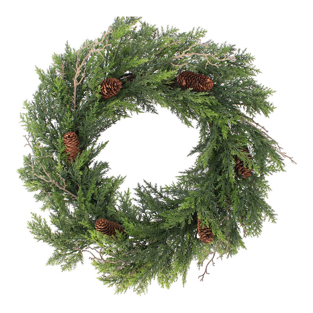 23" Calm Cedar Pine Wreath is backordered and will ship as soon as it is back in stock.
