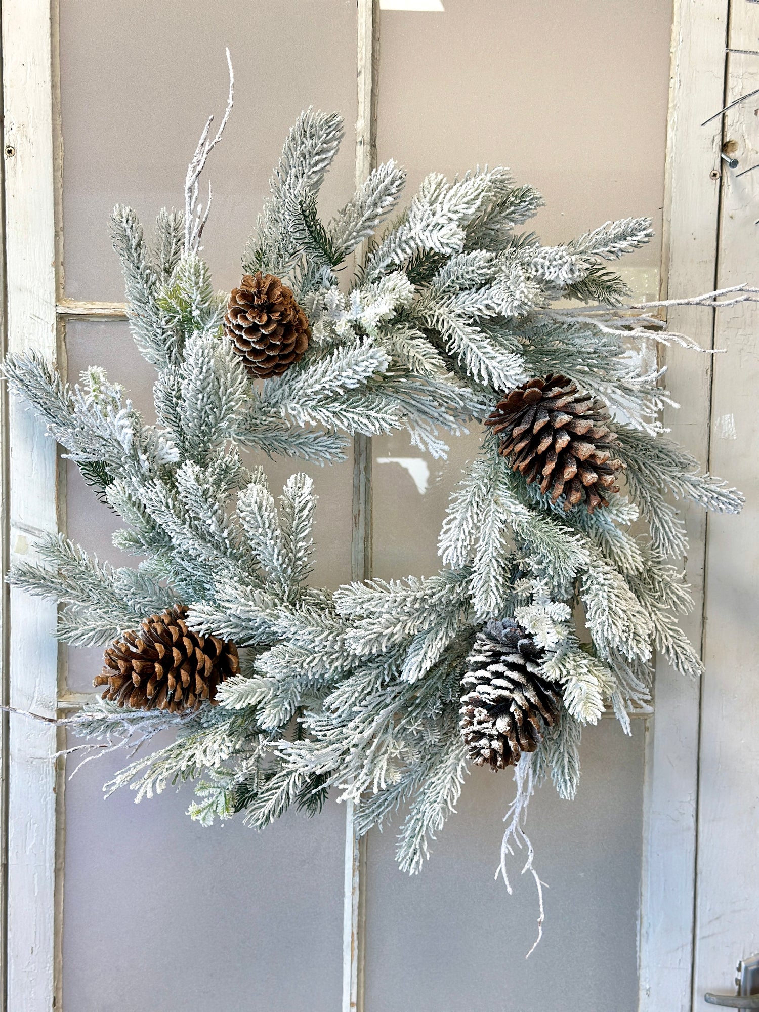 22-24" PLASTIC SNOWED PINE MIXED WREATH W/PINE CONE & TWIG.