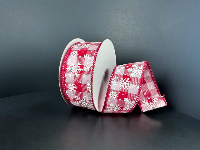 Pnk-Rd Chex Satin/Snowflakes, 1.5"X10Y